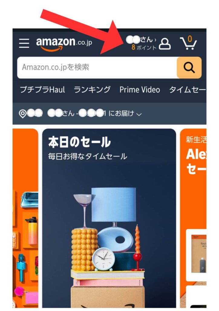 まずブラウザでAmazonにログインして、右上の〇〇さんのアカウント&リストをタップ。