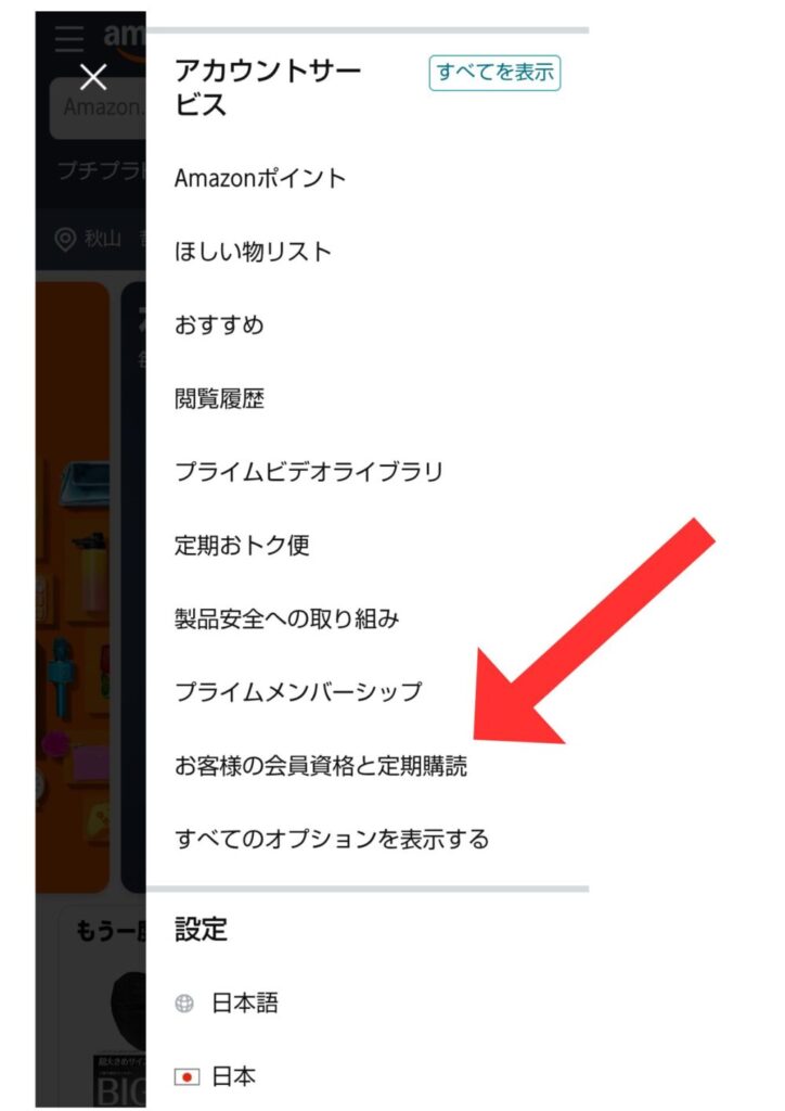 そして、アカウントサービスの項目の中にある、お客様の会員資格と定期購読をタップ。